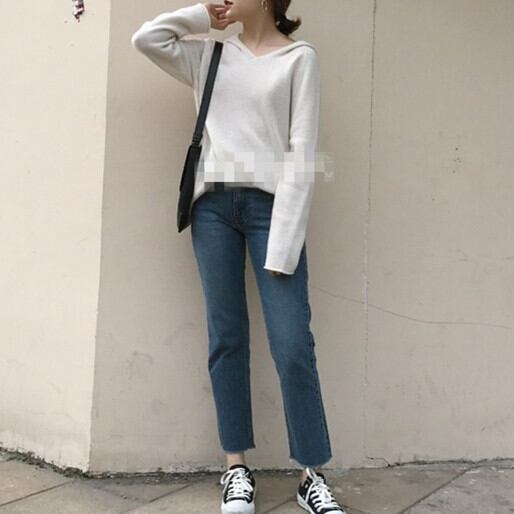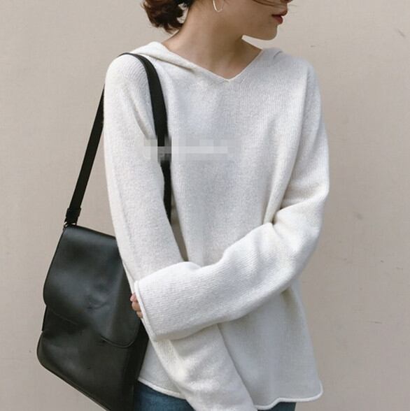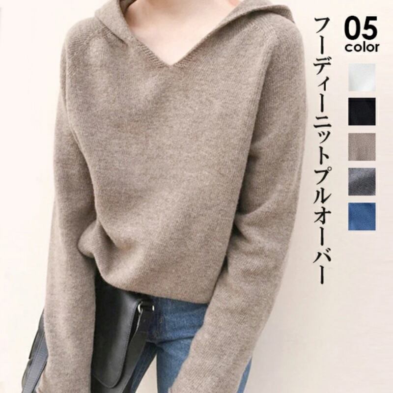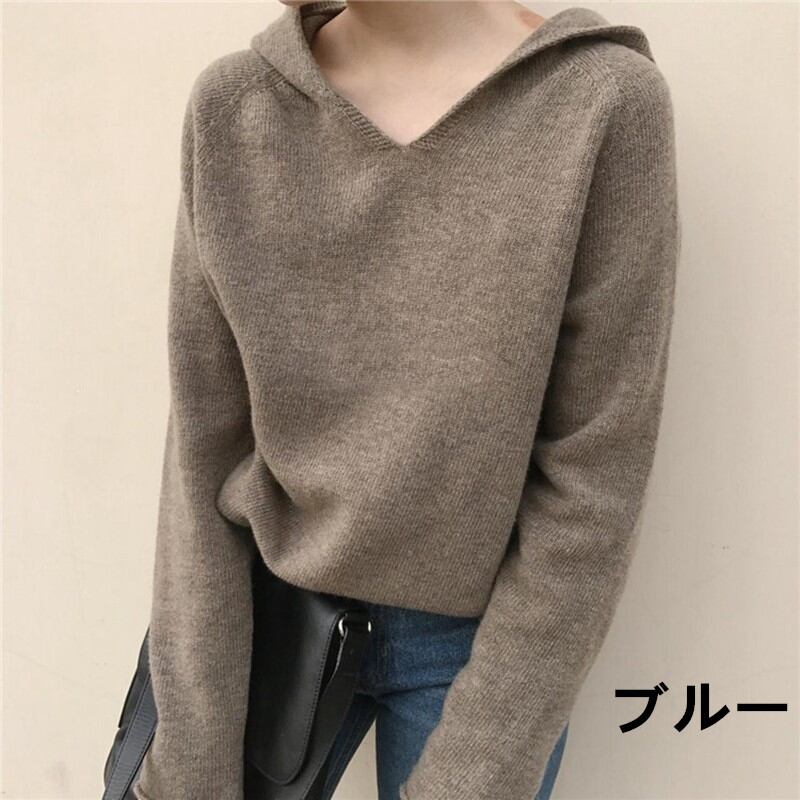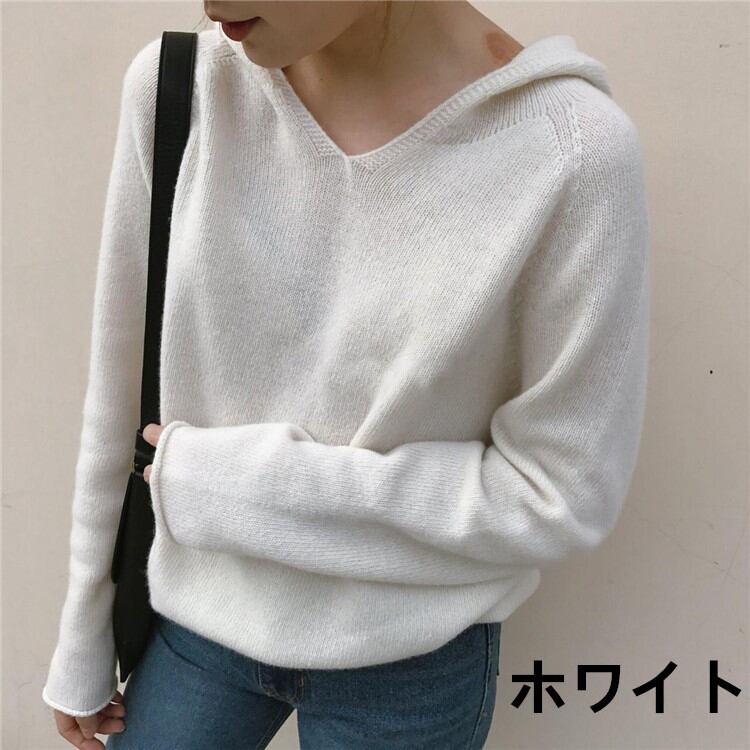 フードニット レディース Vネック ニット プルオーバー 長袖Tシャツ セーター パーカー プルオーバー