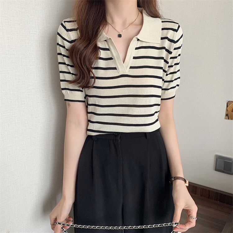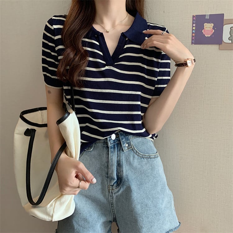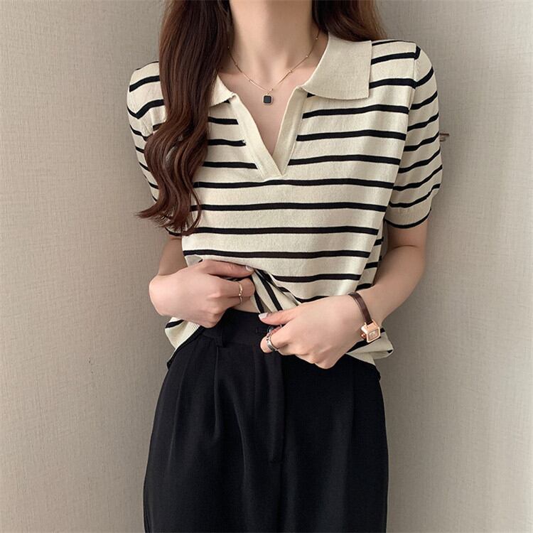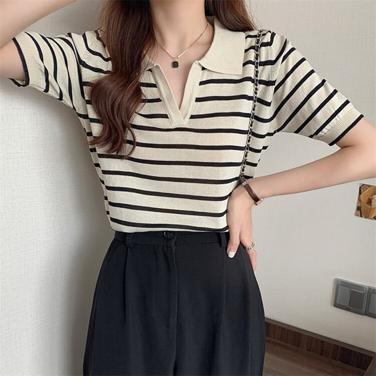 ニット ストライプ Tシャツ デザインセンス Vネック トップス レディース 半袖 夏