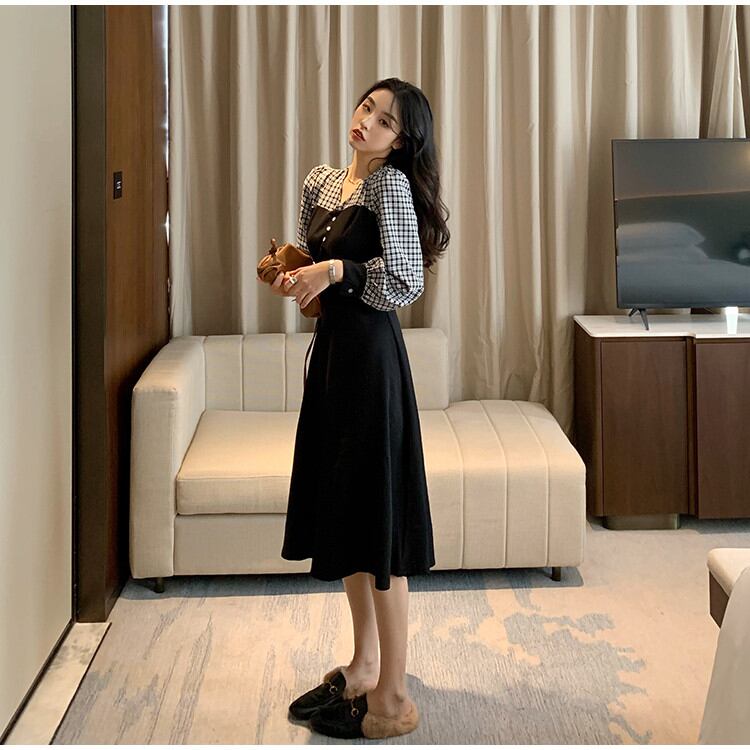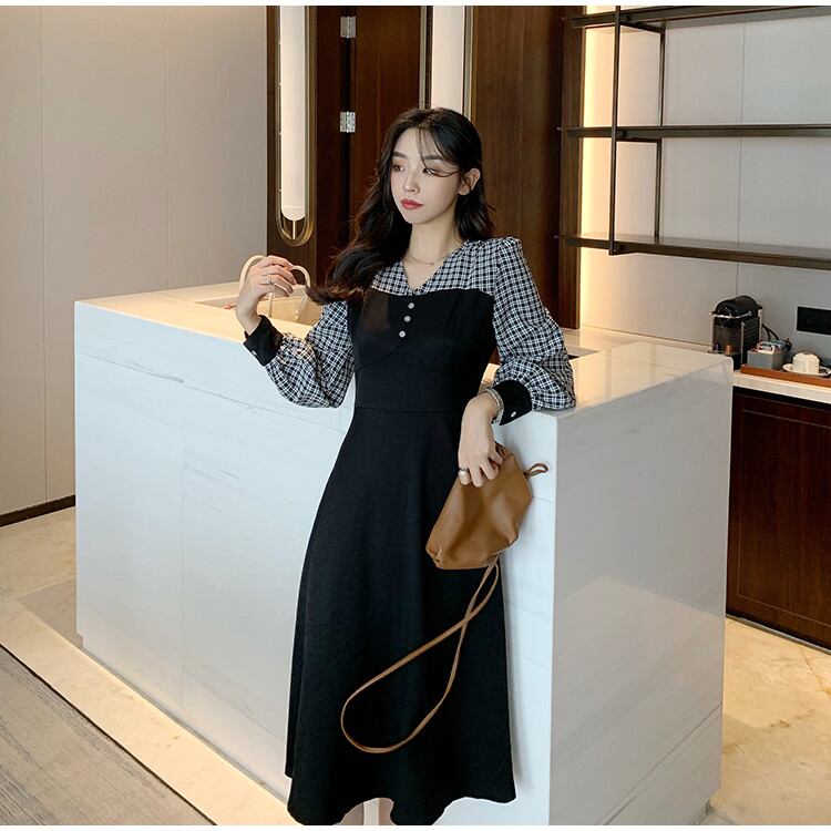 チェック柄 ロングスカート エレガント 快適 長袖 ワンピース