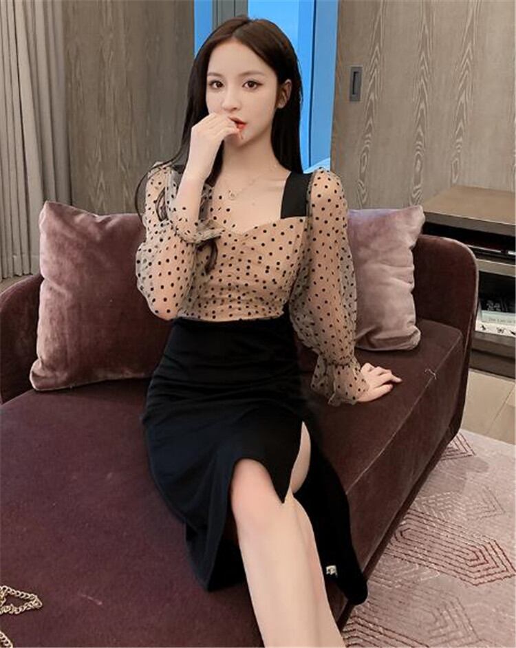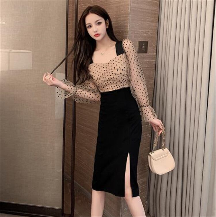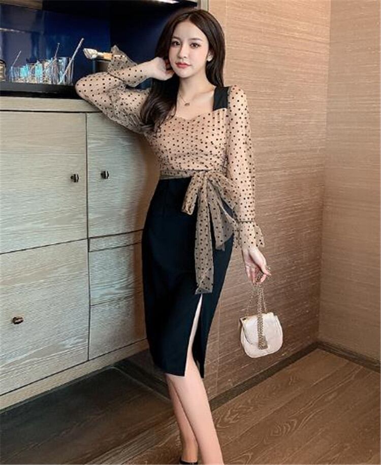スリム 縫付 ワンピース 女性 スリット入り ドット リボン