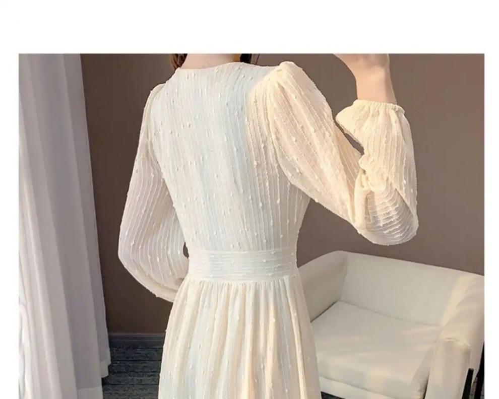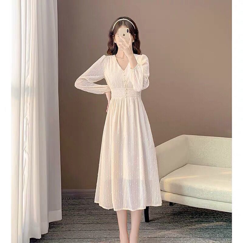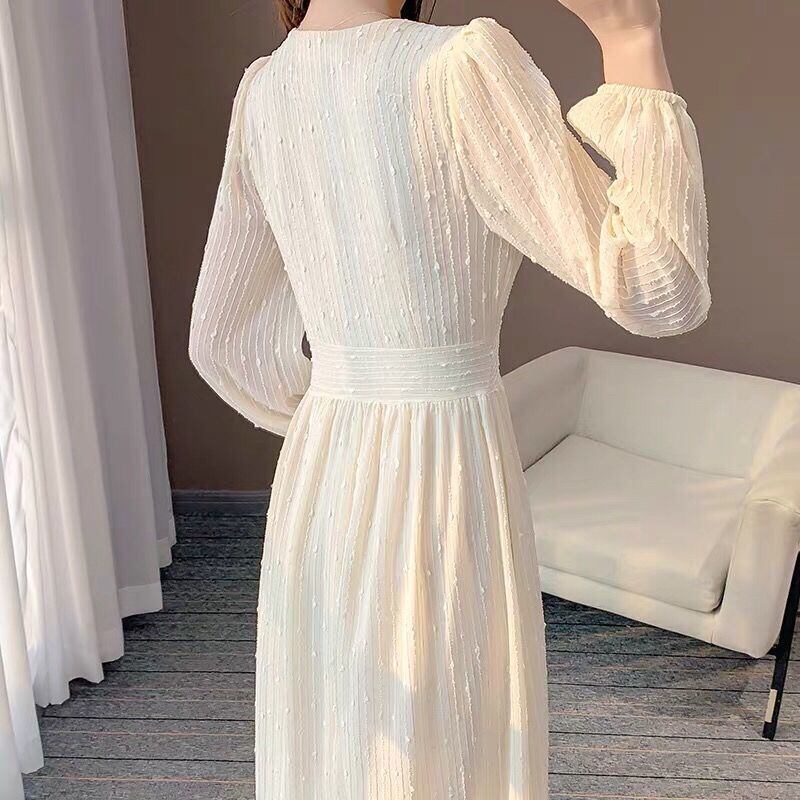 秋冬 レトロ シフォン Vネック シンプル ワンピース スリム